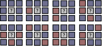 Local majorities are created when a seat is completely surrounded by other claimed seats. As a result the ownership of the seat is challenged. The seat is flipped to the side with the greatest number of surrounding seats. For example, the following local majorities would win the centre seat for Blue: