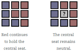 If all surrounding seats are held equally by Red and Blue the centre seat is counted. As a result, if the centre seat is red it remains red, if it is blue it remains blue. If the centre seat is neutral, it remains neutral until the composition of the surrounding seats changes or a player claims the seat directly. For example: